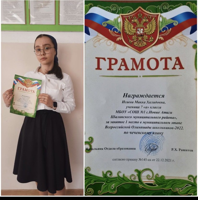 Награждается Исаева Макка Халидовна, ученица 7а класса МБОУ "СОШ №1 с.Новые Атаги", за занятое 1 место в муниципальном этапе Всероссийской Олимпиады школьников-2022г. по чеченскому языку