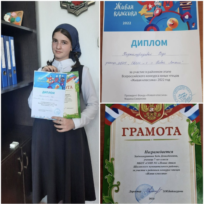 Нагаждается Хаджимуратова Хеда, ученица 7а класса МБОУ "СОШ №1 с.Новые Атаги", за участие в районном этапе Всероссийского конкурса юных чтецов "Живая классика" 2022г